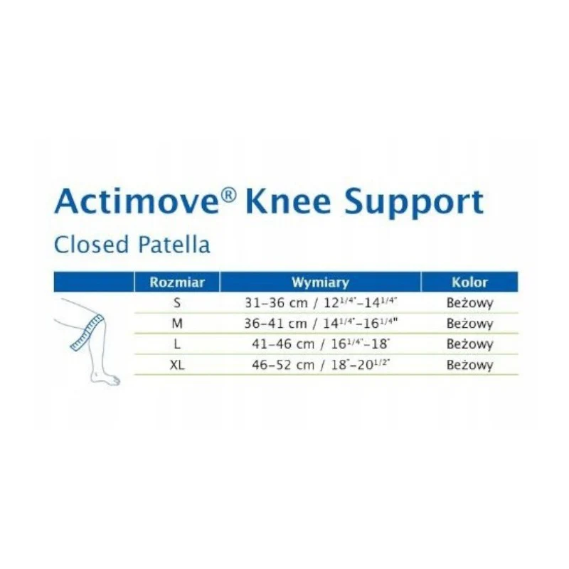 La rodillera con rótula cerrada y 2 flejes estabilizadores de Actimove® es una órtesis textil elástica de punto circular, lista para usar en la articulación de la rodilla, con flejes en espiral a cada lado y diseño de rótula cerrada