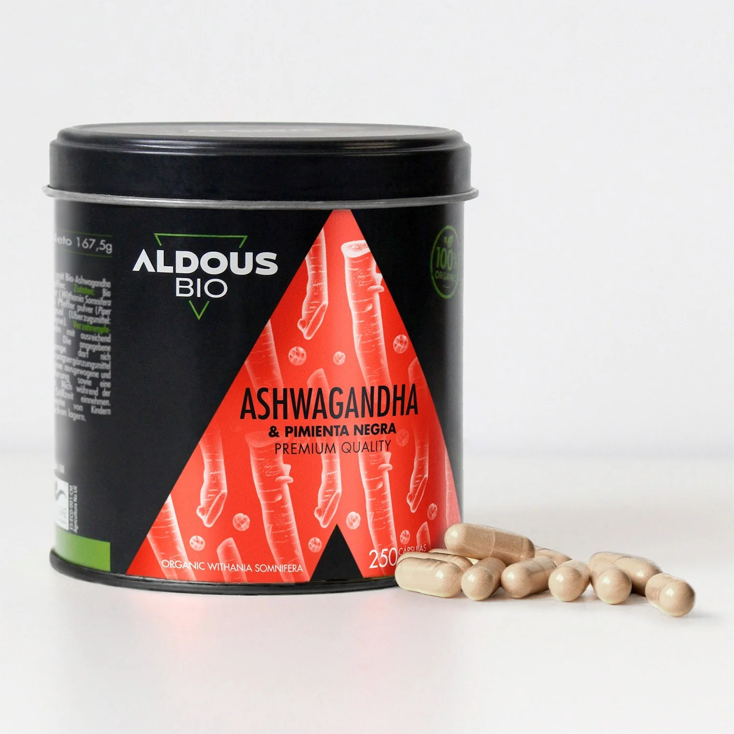 Aldous Ashwagandha Orgánica 2160 mg con Pimienta Negra 250 Cápsulas