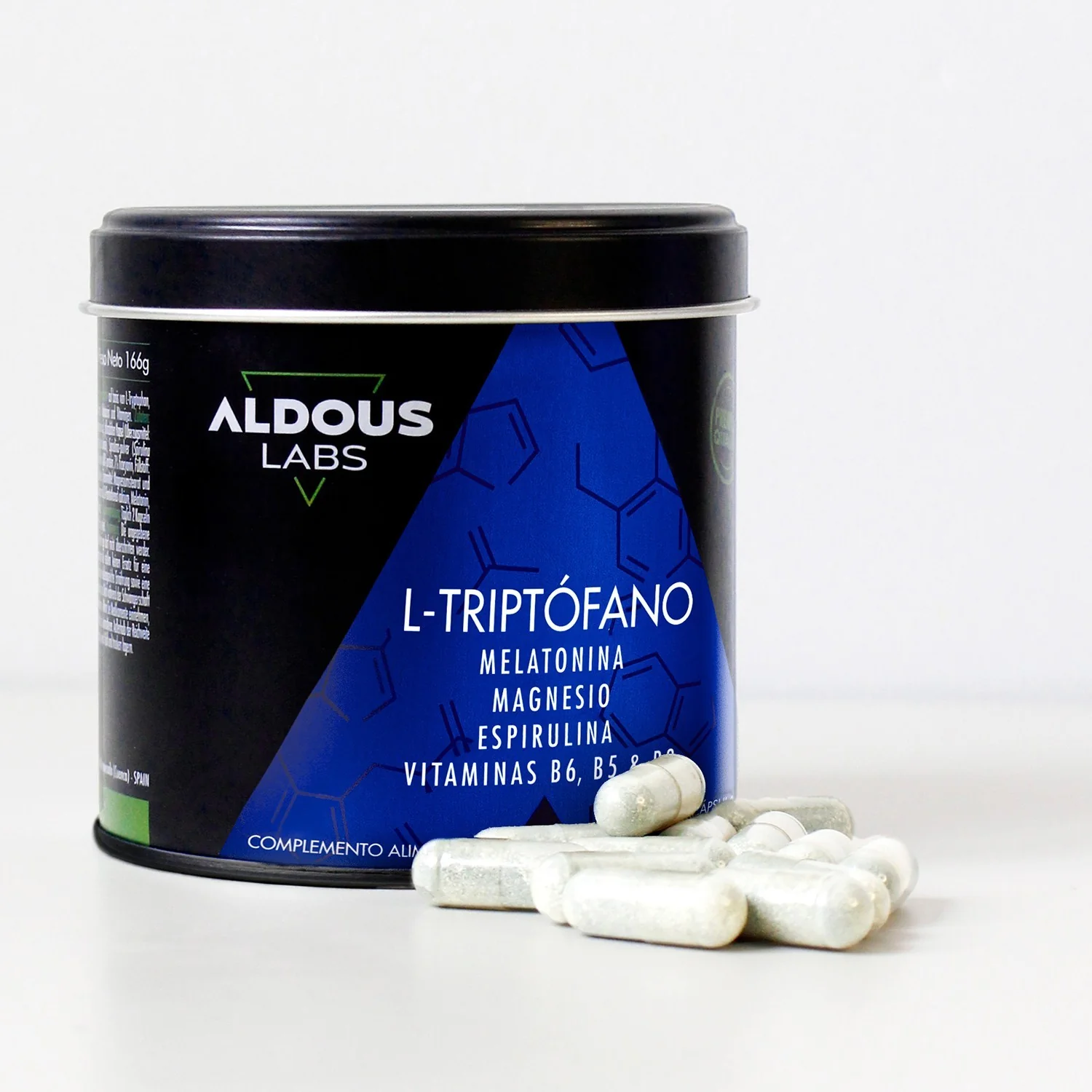 La formulación avanzada de Triptófano Aldous está compuesta también por Melatonina, Magnesio, Espirulina y Vitaminas B. Nuestra fórmula avanzada 100% natural contiene una mayor concentración de Melatonina, Triptofano y Magnesio para que tengas un sueño profundo.