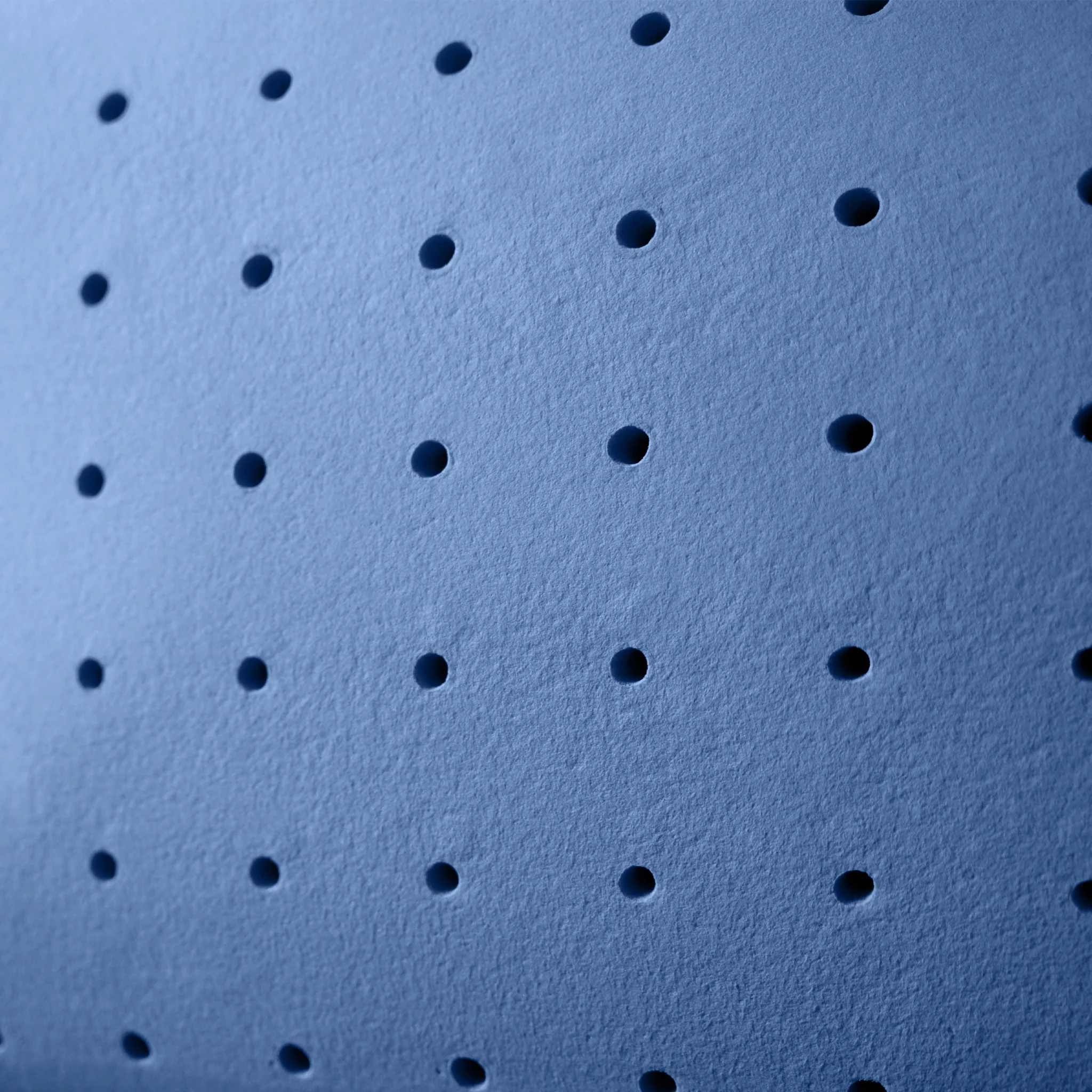 Con un núcleo viscoelástico perforado enriquecido con partículas de gel, esta almohada ofrece una gran capacidad de adaptación y efecto termorregulador. Su firmeza blanda y textura suave envuelven la cabeza con una agradable sensación de frescor, ideal para quienes buscan un confort equilibrado durante toda la noche.