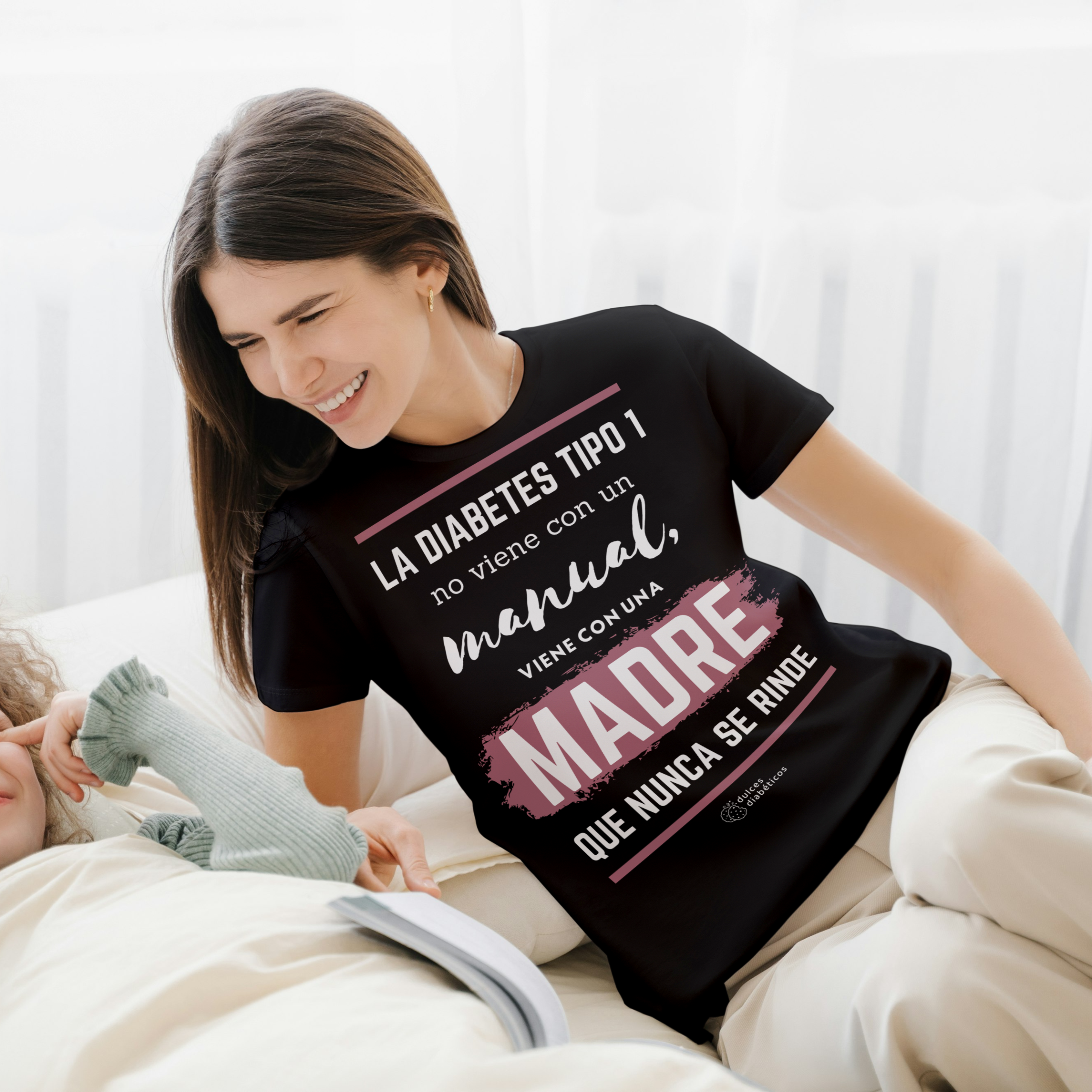 Camiseta negra de manga corta para mujer. Tiene estampada la frase «La diabetes tipo 1 no viene con un manual, viene con una madre que nunca se rinde». ¡El regalo perfecto!