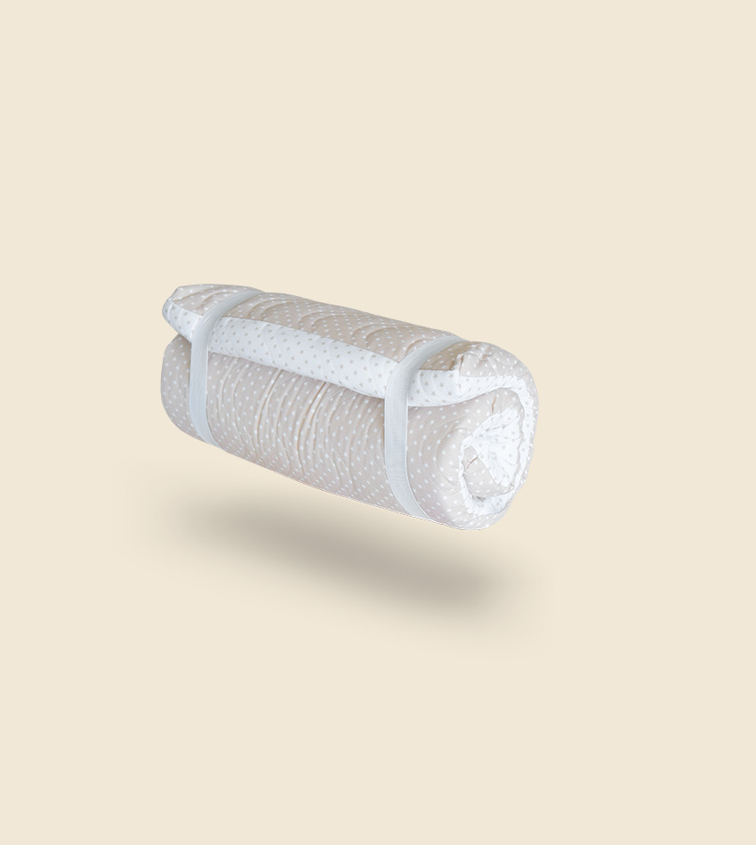 El colchón de viaje Basic es fácil de transportar, ideal para viajes o segundas residencias. Su diseño mejora la adaptabilidad y firmeza ofreciendo un descanso cómodo y de calidad durante el viaje. Su funda loneta con estampado estrella es de gran suavidad.