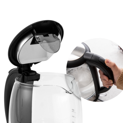 El hervidor de Cristal Eléctrico caliente el agua en solo 3 minutos. Tiene una capacidad de 1.7L y 1850-2200W de potencia. Fabricada en vidrio y acero inoxidable, garantiza pureza y durabilidad, mientras que su luz LED azul indica el estado de ebullición. Con protección de seguridad avanzada y diseño compacto, es ideal para cualquier cocina.