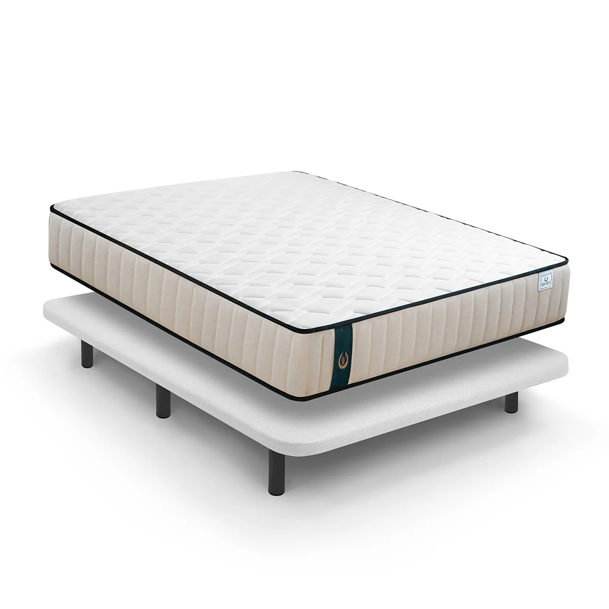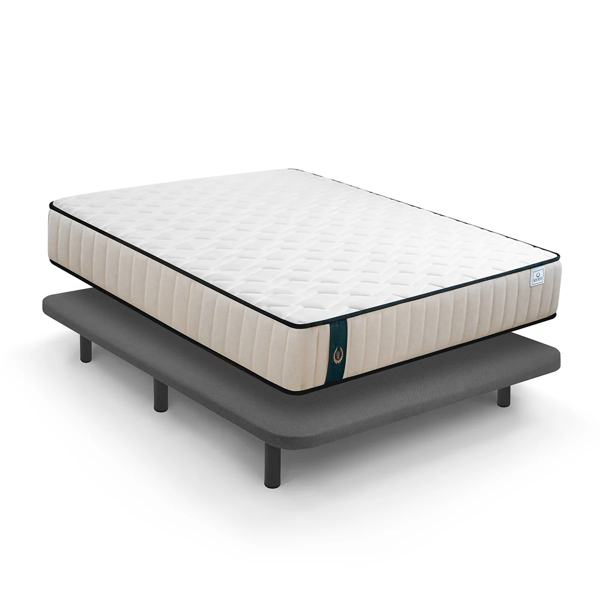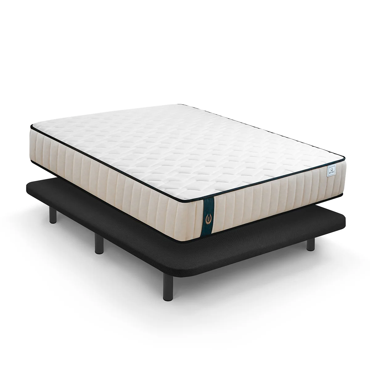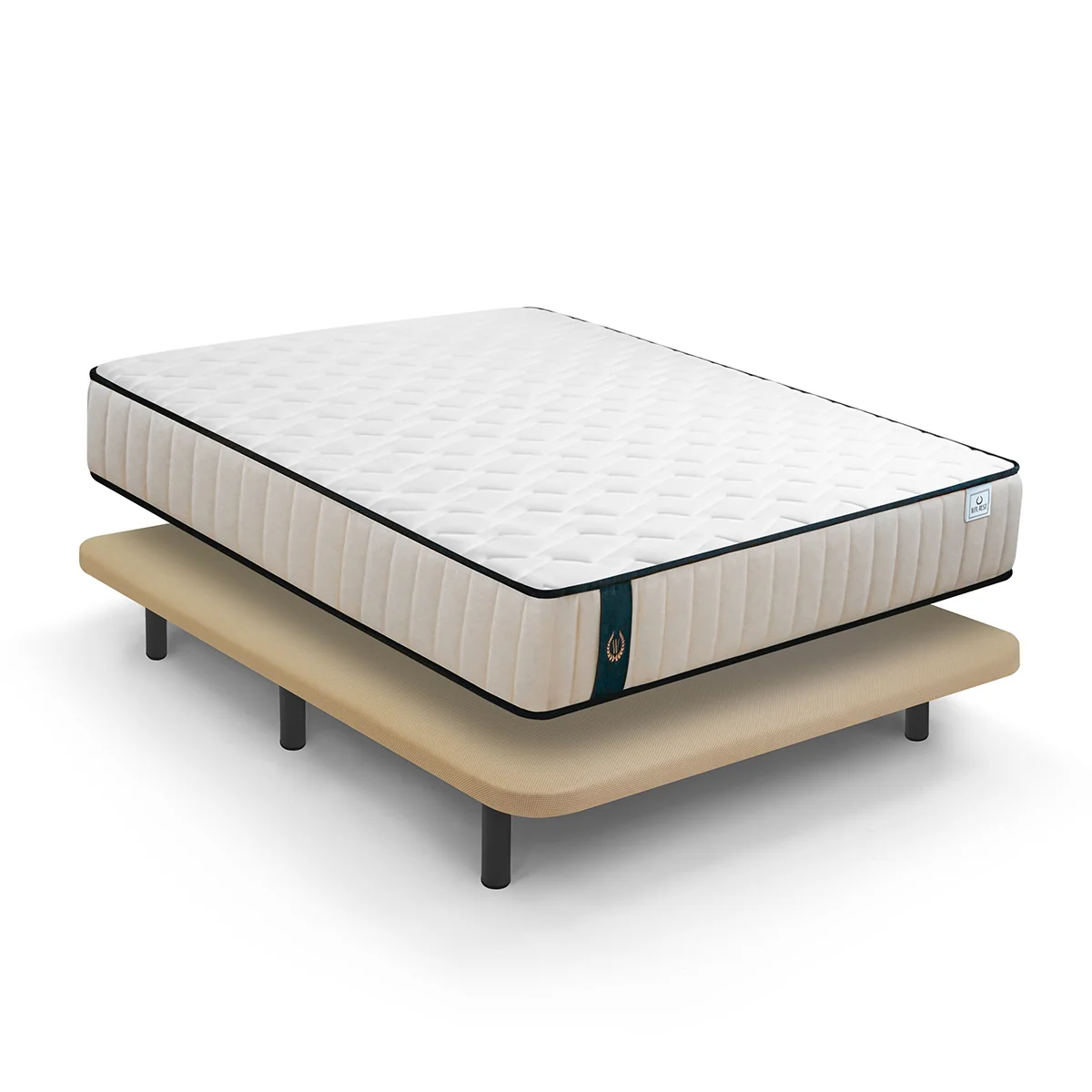 Pack Base tapizada fabricada 3D Cibeles, con estructura reforzada de tubo acerado de 40x30mm con 5 barras transversales de refuerzo, tablero superior de partículas (aglomerado) de 10mm con colchón viscoelástico MAXIMUS incorpora un núcleo de espuma con gran densidad y alta recuperación, que aporta firmeza, junto a su exclusivo acolchado compuesto por 2cm de viscoelástica.
