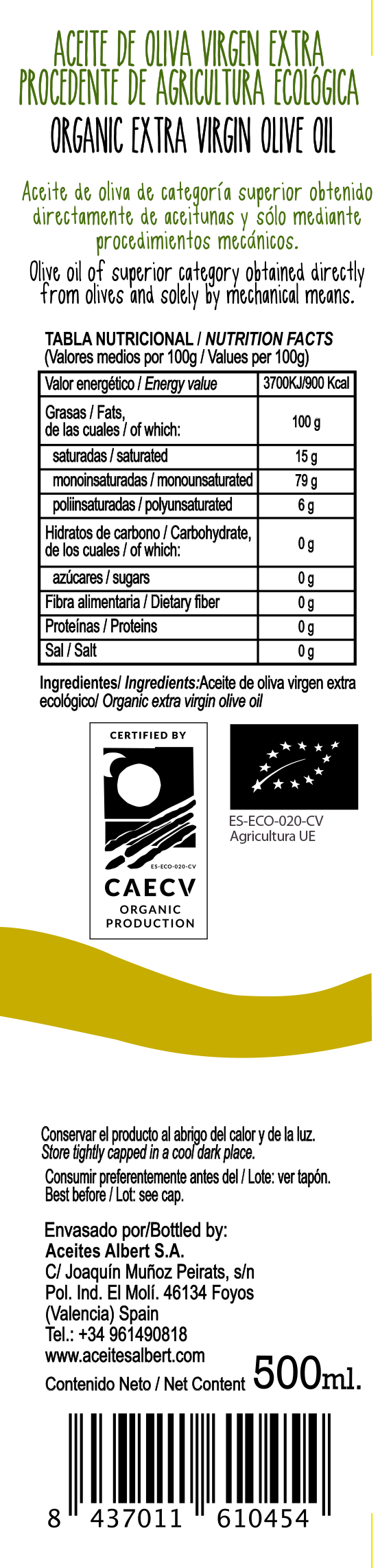- 1 botella Aceite de Oliva Virgen Extra Ecológico 500 ml