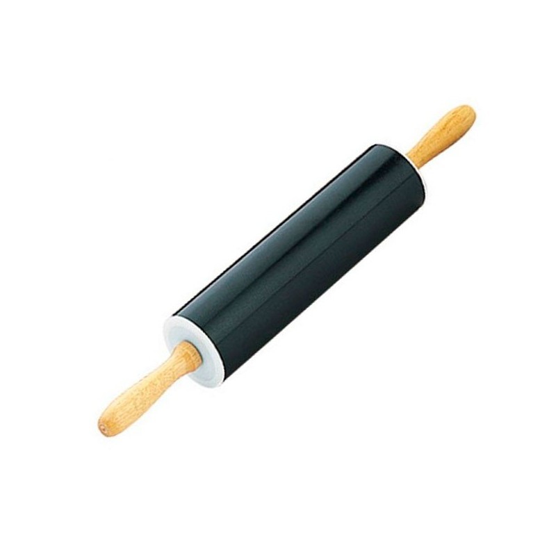 Rodillo de amasar Ibili, de chapa de acero antiadherente negra con los mangos de madera en contraste.