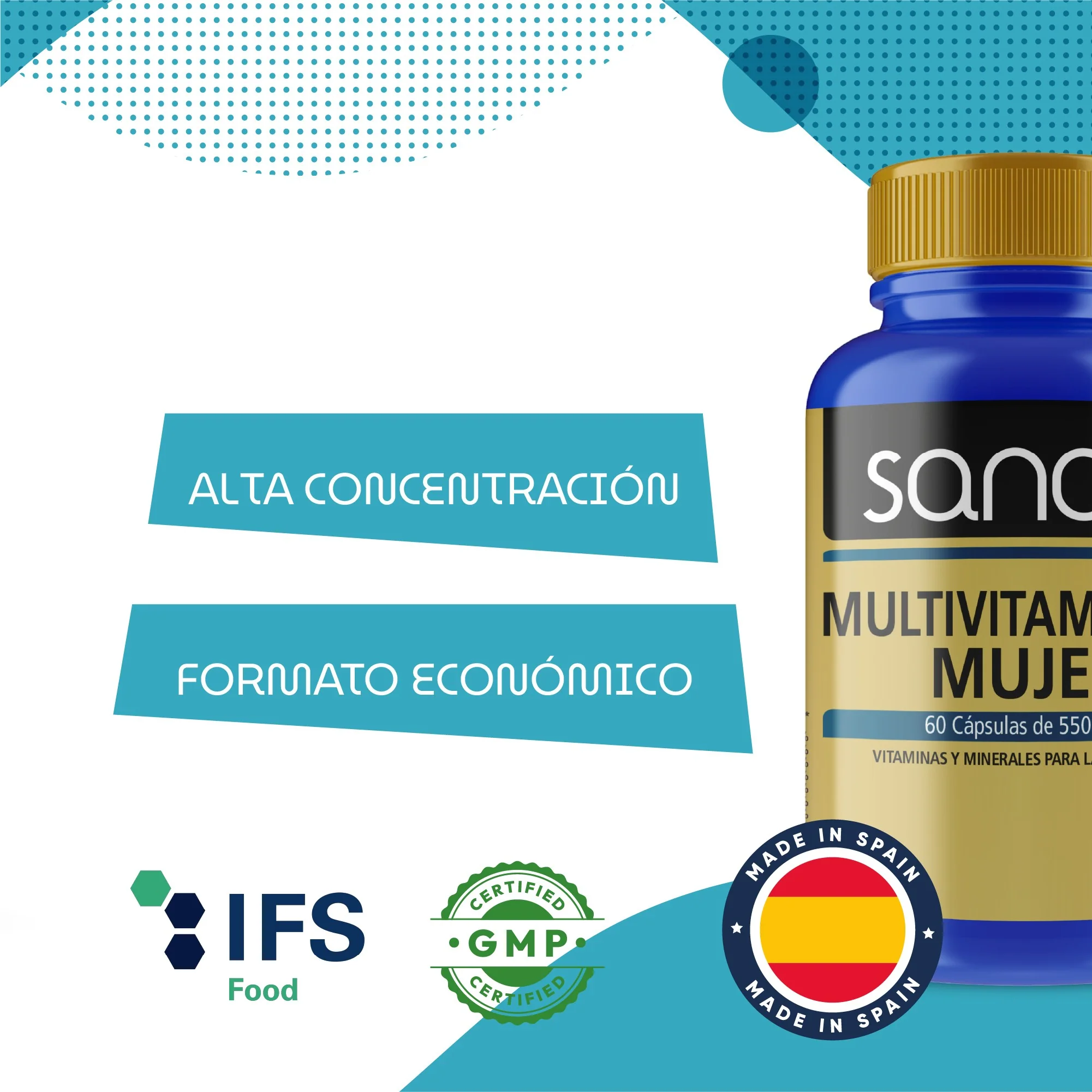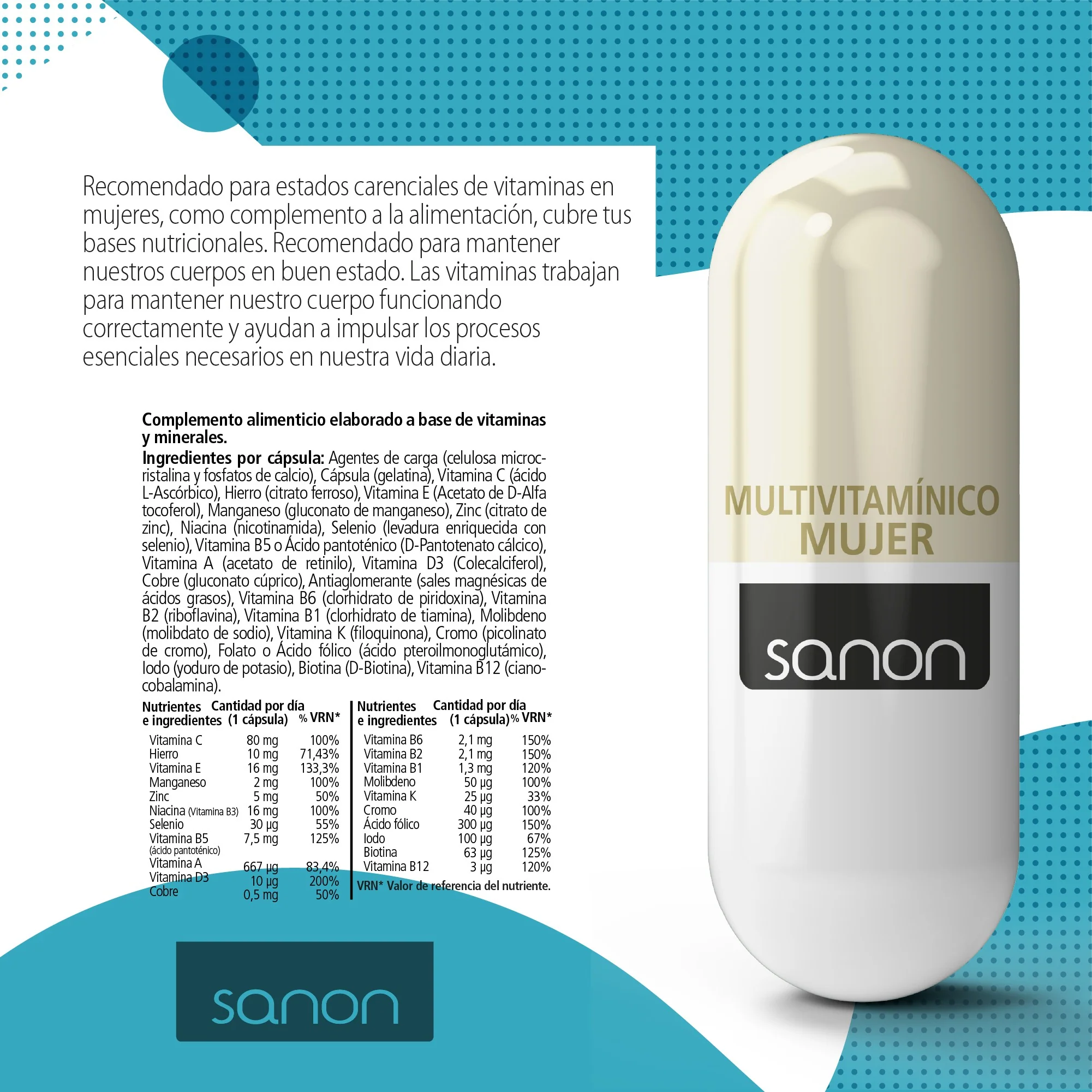 Complemento alimenticio con vitaminas y minerales para adaptarse a las necesidades nutricionales de las mujeres.
