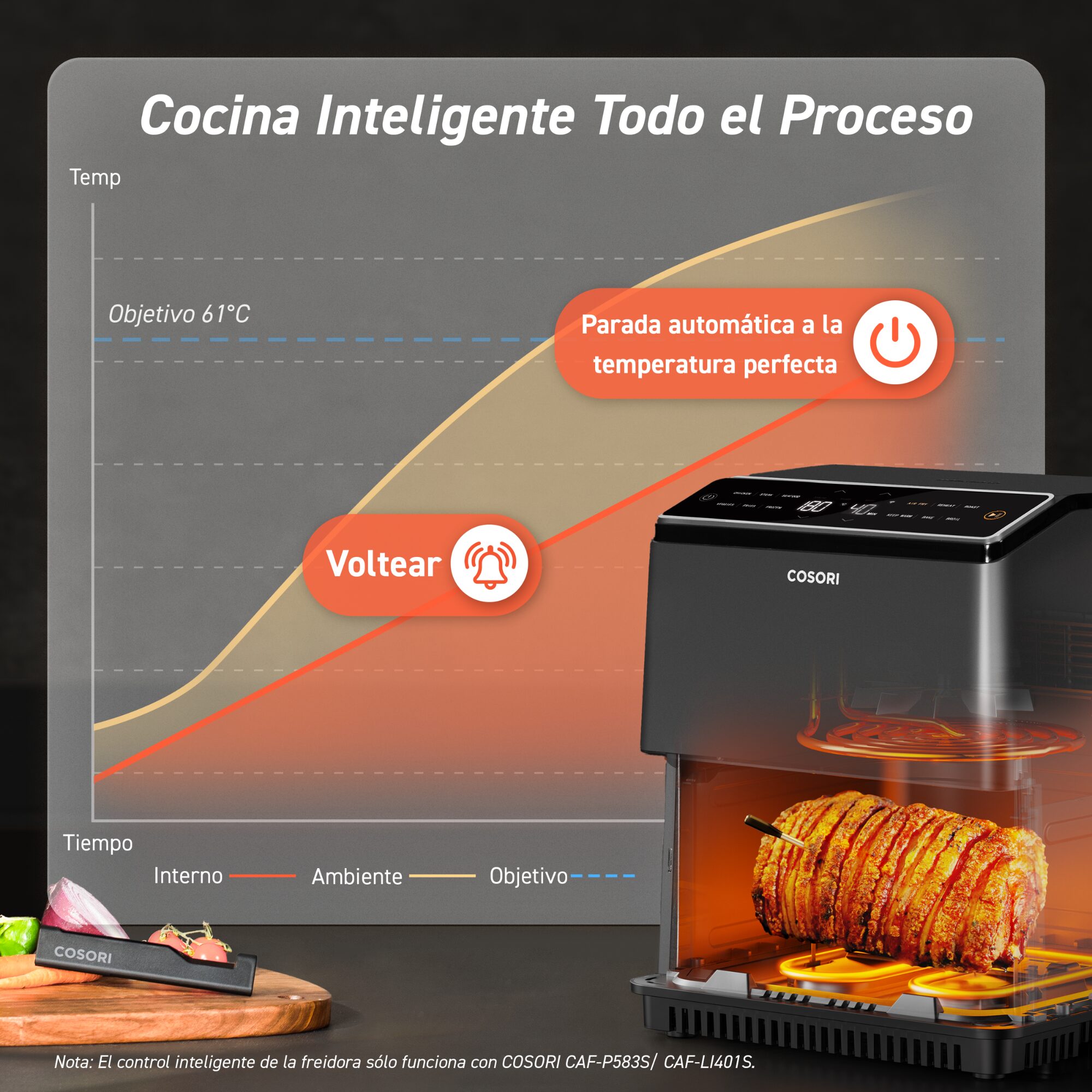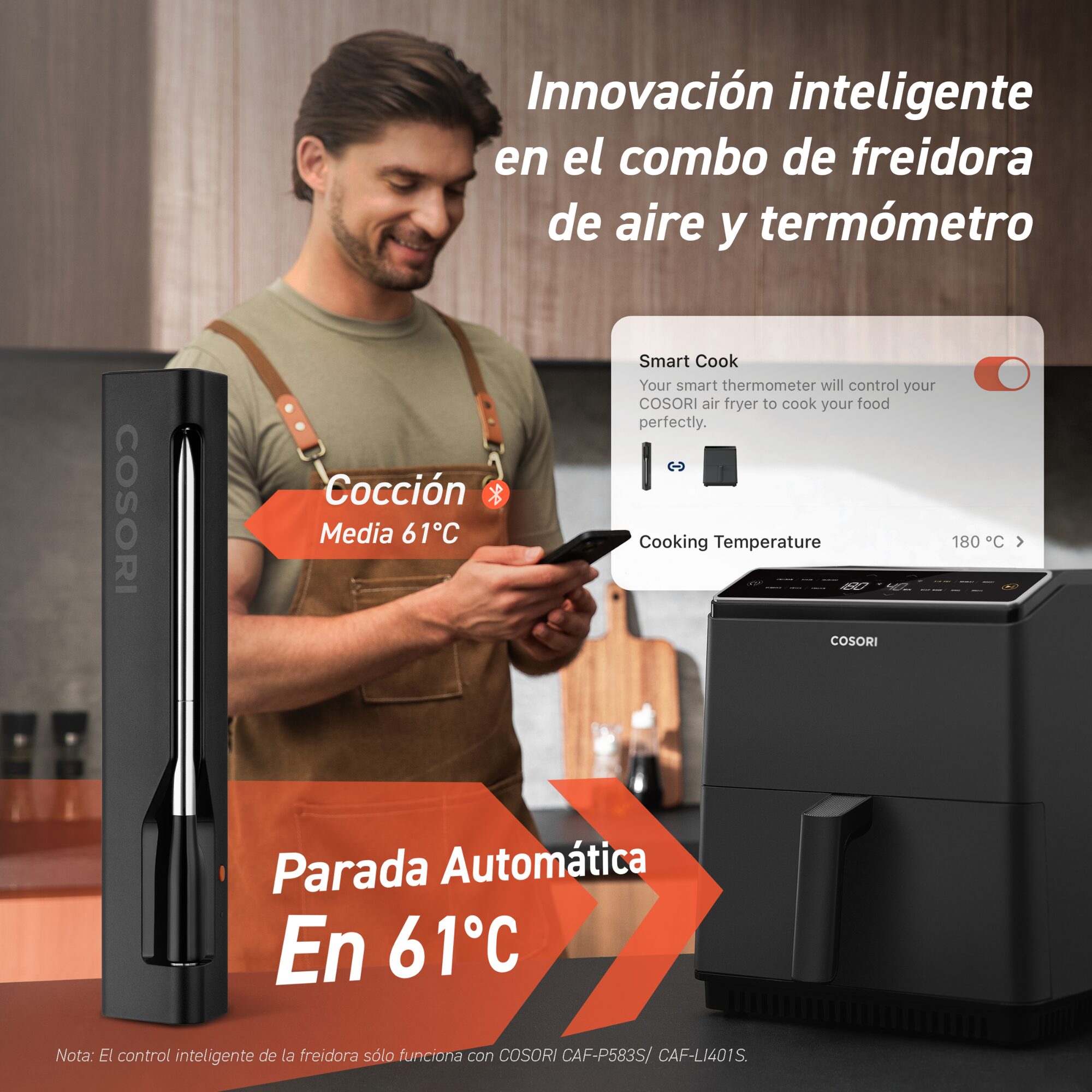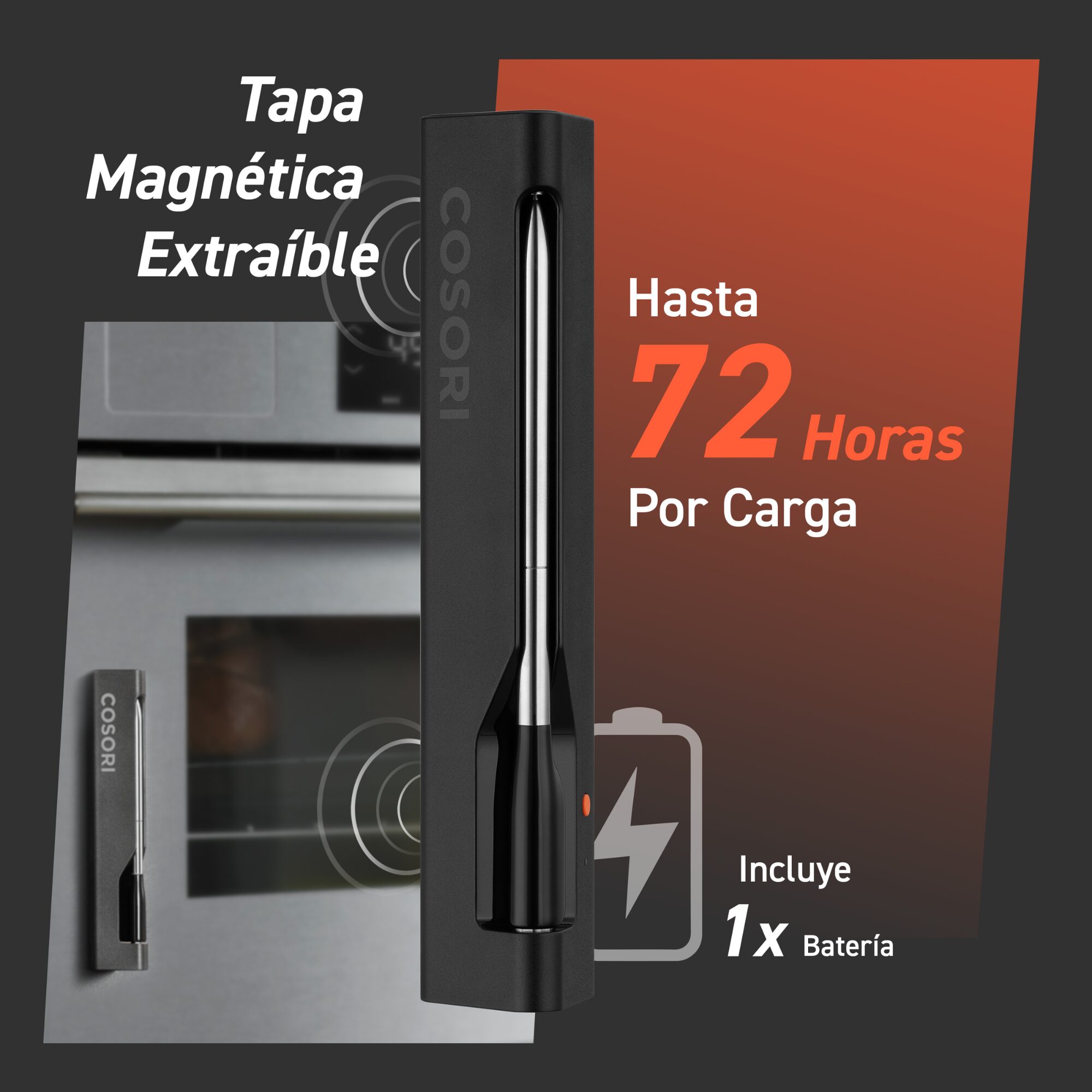 El Termómetro de Carne Inteligente Cosori Chef Edition te brinda precisión y comodidad para asados, barbacoa y más. Con sensores duales para controlar temperaturas internas y ambientales, conexión Bluetooth de hasta 50 metros y batería de larga duración, asegura cocciones perfectas sin supervisión constante. Su diseño resistente al agua y almacenamiento magnético integrado lo hacen práctico y fácil de usar. Es compatible con la freidora de aire Cosori Dual Blaze Chef Edition, convirtiendose en el aliado ideal para cocinar con precisión y disfrutar de más tiempo con los tuyos.