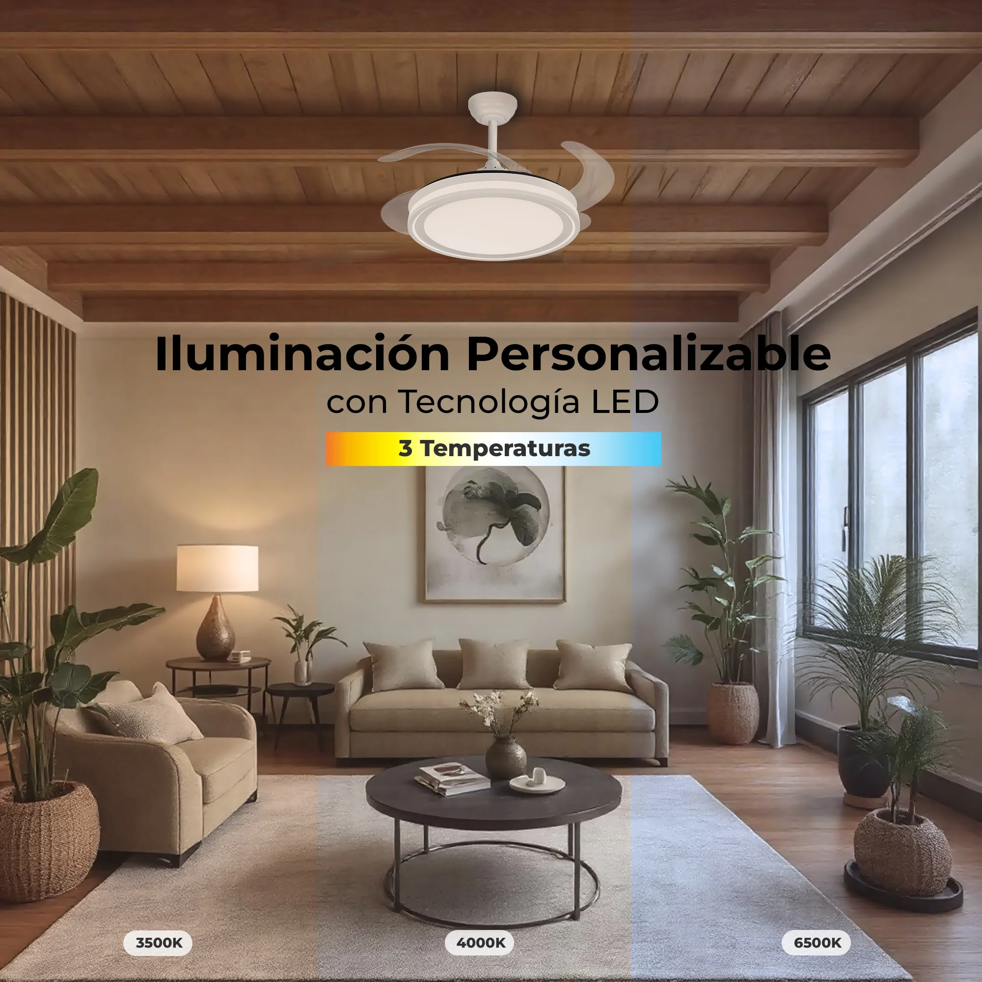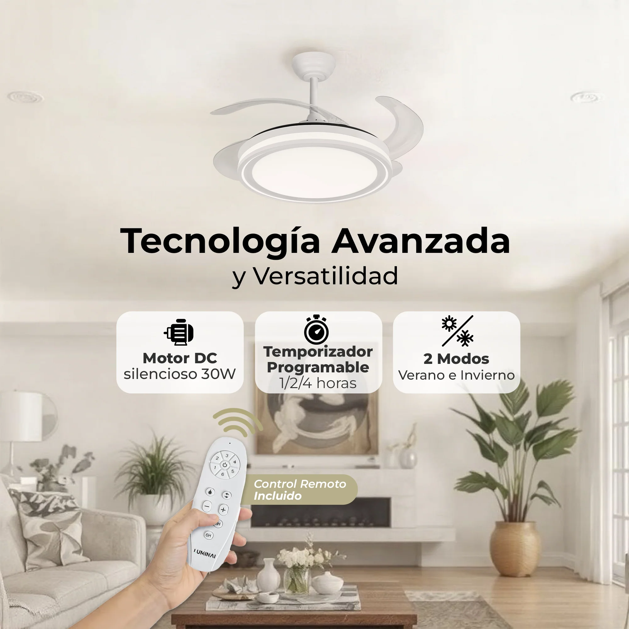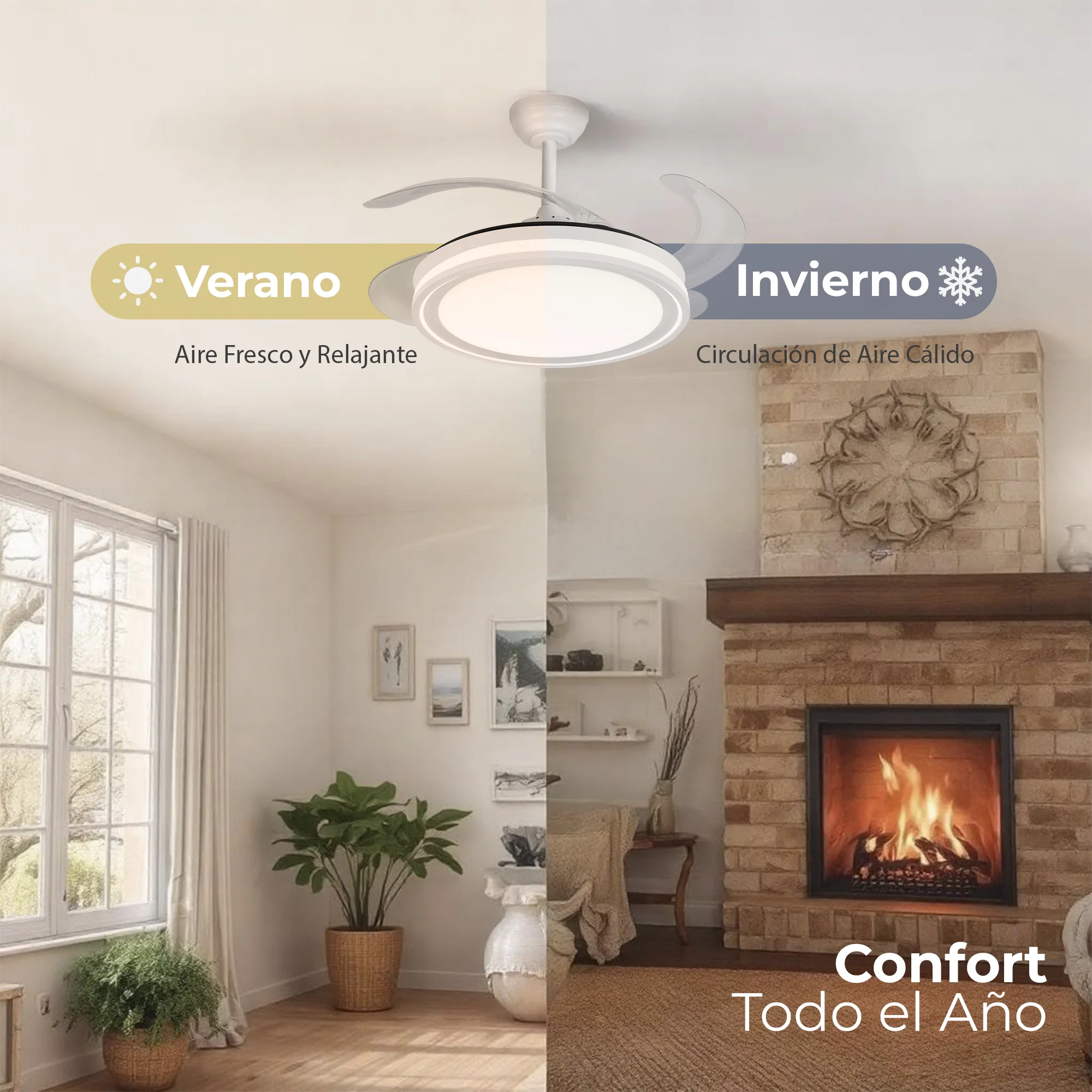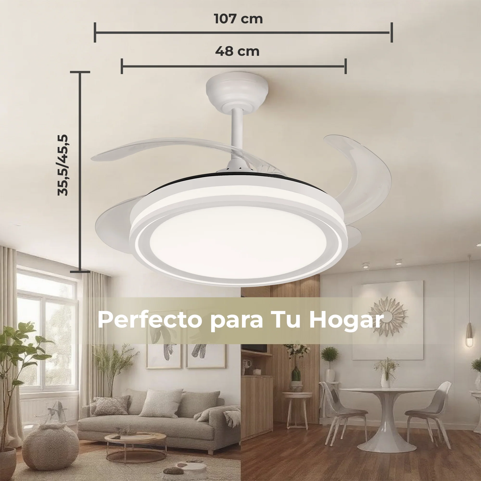 ASPAS RETRÁCTILES Y TRANSPARENTES: Ideal para espacios con techos bajos o para aquellos que prefieren un aspecto más discreto. Las aspas se retraen cuando el ventilador no está en uso, lo que permite que se mezcle con el techo.