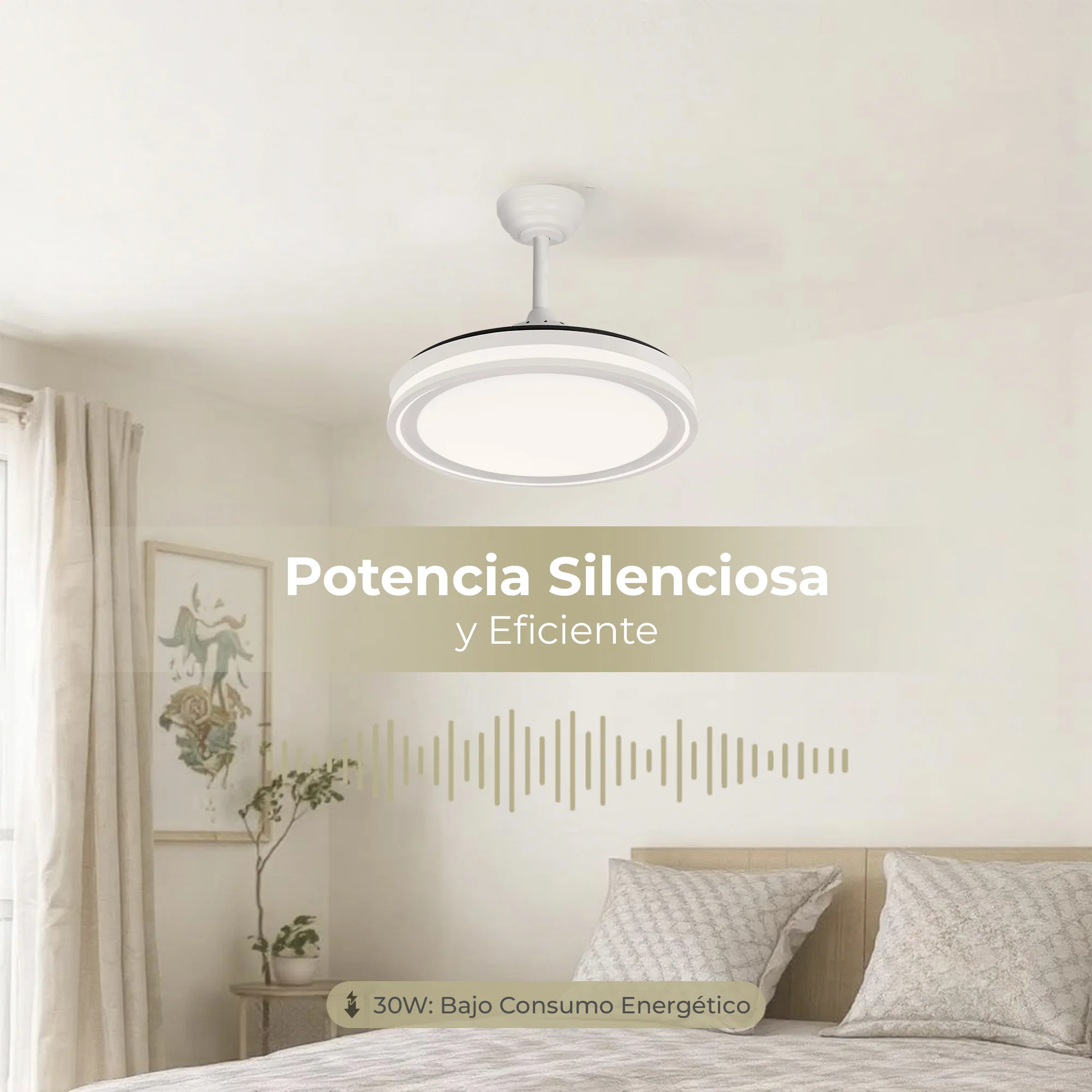 SILENCIOSO Y EFICIENTE: Motor de 30 W de potencia. Nuestros ventiladores de techo son conocidos por su funcionamiento silencioso. No perturbarán su descanso ni añadirán ruido de fondo a su espacio. Además, son eficientes en términos de energía.