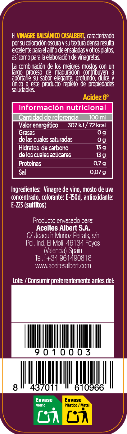 Caracterizado por su coloración oscura y su textura densa, resulta excelente para el aliño de ensaladas y otros platos, en especial de carne, así como para la elaboración de vinagretas.